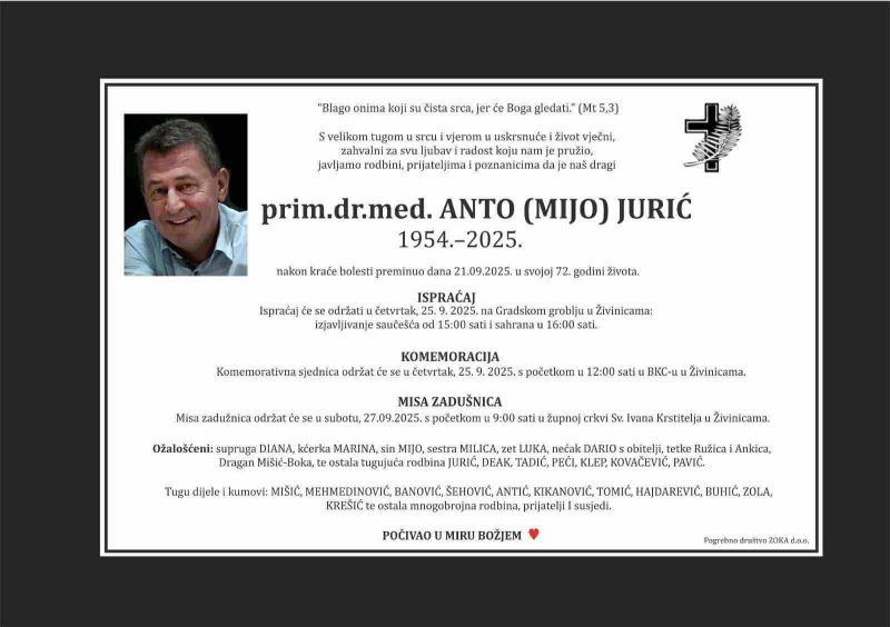 „Srca su nam tužna, ali puna poštovanja prema čovjeku od koga se opraštamo, koji je ostavio neizbrisiv trag u našim životima. Našeg dragog prijatelja, kolege i brata po ljudskosti doktora Ante Jurića.