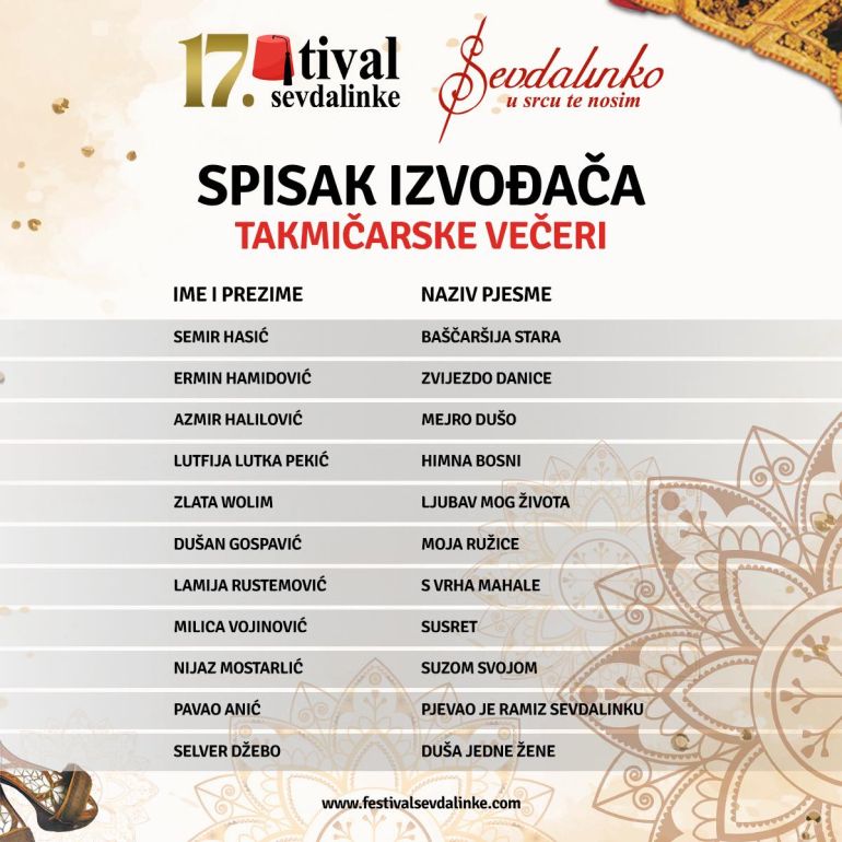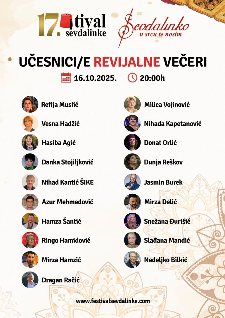 U takmičarskoj večeri, 15. oktobra, publici će se predstaviti 11 novih autorskih djela, kroz koja će se birati dobitnik prestižne Plakete “Safet Isović”, simbola tradicije i umjetnosti. Dan kasnije, 16. oktobra, u revijalnoj večeri, publika će uživati u izvedbama afirmisanih izvođača i doajena sevdaha, čiji će glasovi donijeti autentičnu emociju i duh Bosne i Hercegovine.